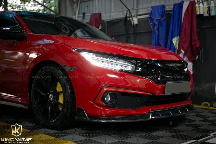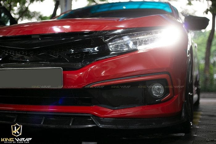 Civic phần đầu được thiết kế khá giống với phiên bản xe thể thao, thêm vào bộ cánh màu đỏ nổi bật hơn hẳn so với phiên bản gốc màu trắng. Chọn chất liệu decal Teckwrap cao cấp màu sắc chân thực và có chiều sâu khiến Civic đẹp lung linh hơn.