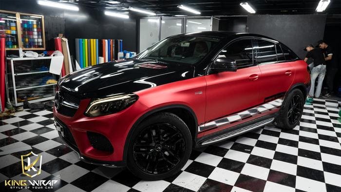 Riêng về thiết kế của Mercedes-AMG GLE 43 đã tạo ra sự phá cách rồi. Nhưng chủ xe muốn có một sự đột phá và quyết định dán đổi màu với nửa trên màu đen bóng và nửa dưới màu đỏ matte. Sự kết hợp tưởng chừng như cặp lệch nhưng lại tạo nên một siêu phẩm tại gara Kingwrap. Siêu phẩm có một không hai.