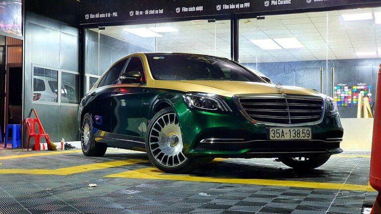 Dán decal đổi màu oto Mercedes S450 style Maybach tông màu Xanh ánh nhôm GAL29S kết hợp Vàng Gold tại Kingwrap. Một màn lột xác đầy ấn tượng được thực hiện bởi các kĩ thuật viên của Kingwrap. Đến với Kingwrap bạn sẽ được tư vấn về các mẫu dán decal đổi màu oto và tem xe oto đẹp nhất hiện nay.