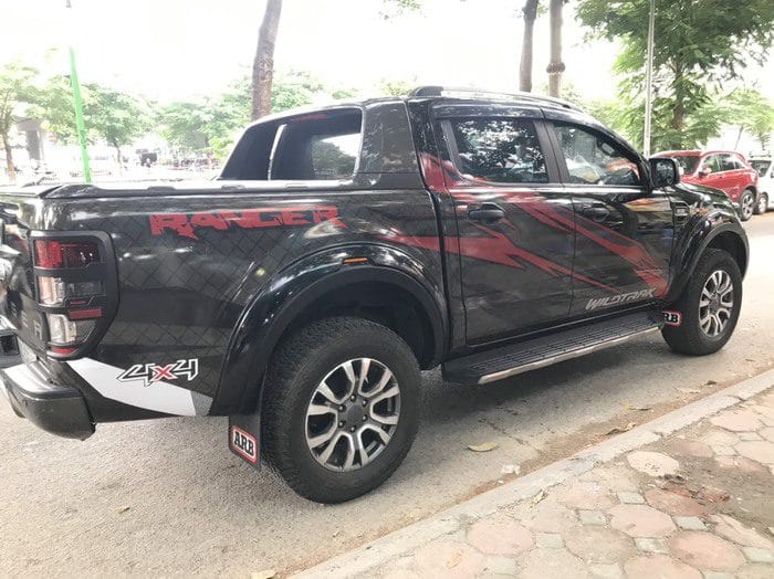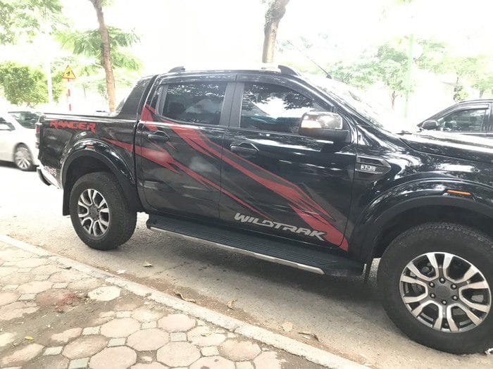 Với mẫu tem thiết kế Ranger Wildtrack màu đỏ nổi bật, phần đuôi xe được họa thêm họa tiết caro in trên decal trong thoắt ẩn hiện trên nền sơn gốc. Họa tiết vân đỏ được thiết kế chéo sườn xe mang lại vẻ đẹp mạnh mẽ và cá tính cho dòng xe bán tải địa hình Ford Raptor