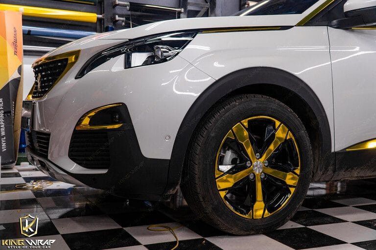 PeuGeot 3008 đã được dán điểm mâm bằng màu vàng chrome bóng gương cực kỳ nổi bật.