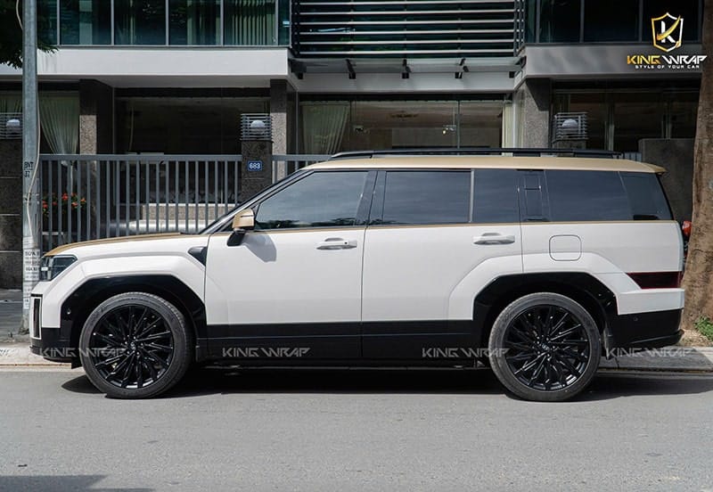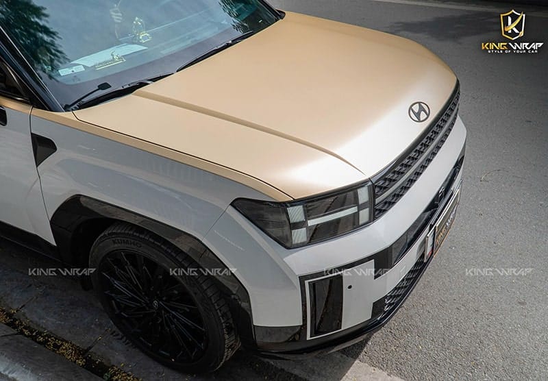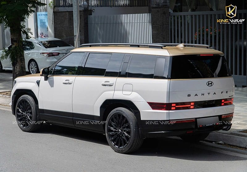 - Dán maybach giúp nâng cấp ngoại hình giúp chiếc xe trông sẽ dài hơn và đặc biệt sẽ trở lên sang trọng, đẳng cấp. Như chiếc Santafe 2024, KingWrap đã phối màu vàng Sâm Panh với màu trắng nguyên bản của xe. Tạo nên tổng thể chiếc xe vừa hiện đại, vừa sang trọng.
