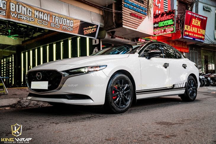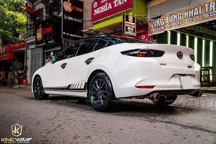 Mazda 3 phiên bản mới được phối 2 màu trắng đen. Nửa trên xe ôm trọn phần nóc là màu đen bóng Black CG01 SH của decal Teckwrap được nhập khẩu từ Mỹ, dòng decal cao cấp cho màu sắc chân thực, tự nhiên như màu sơn gốc. Ngoài ra chủ xe còn chọn dán tem sườn màu đen 2 bên sườn xe tạo điểm nhấn.
