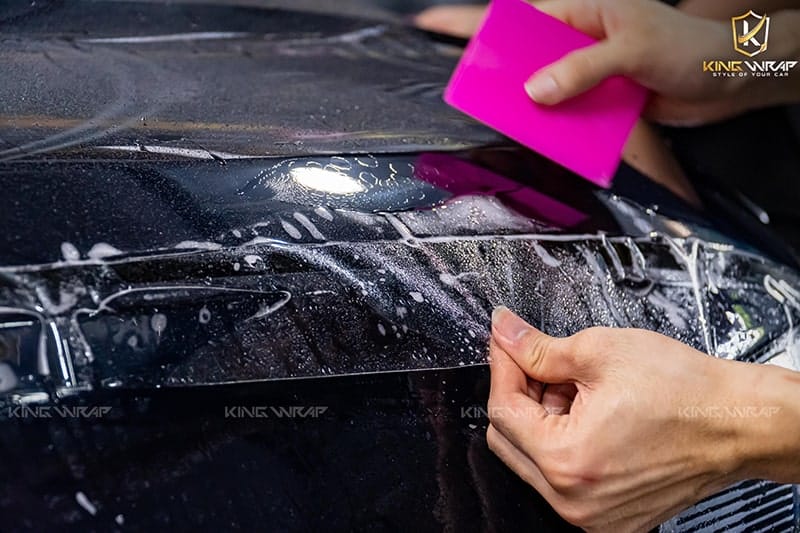 Kỹ thuật viên tiến hành căn chỉnh và dán phim lên từng khu vực của thân xe. Quá trình này đòi hỏi sự tỉ mỉ để loại bỏ bọt khí và đảm bảo lớp phim ôm sát bề mặt sơn.