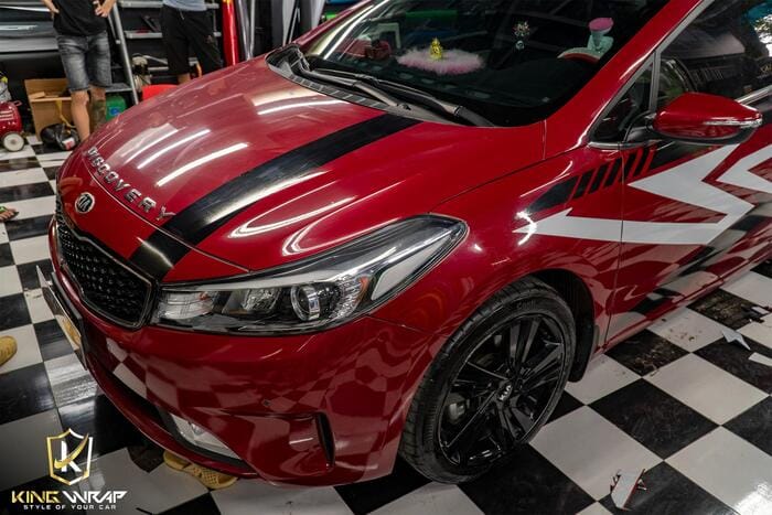 KIA Cerato dòng xe sedan phổ thông được nhiều người biết đến. Nhiều anh em cho rằng Cerato có nhiều nét bo tròn không đủ mạnh mẽ, không phù hợp với dán tem sườn. Vậy thì anh em hãy cũng xem một em KIA Cerato đỏ được dán tem sườn trắng đen tại Kingwrap xem Cerato có “ăn dơ” với bộ tem sườn này không?