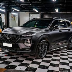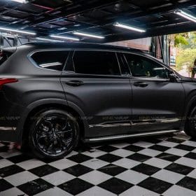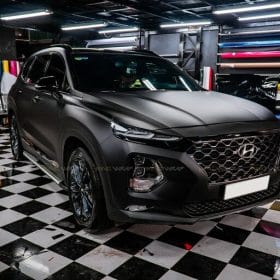 Decal đổi màu xe oto Hà Nội Santafe Đen Lì bằng chất liệu decal cao cấp Teckwrap mã màu CM01. Vẫn là gam màu đen nhưng không còn là đen “bóng bẩy” mà thay vào đó là gam màu đen lì “khoẻ khoắn” đầy sức hút.