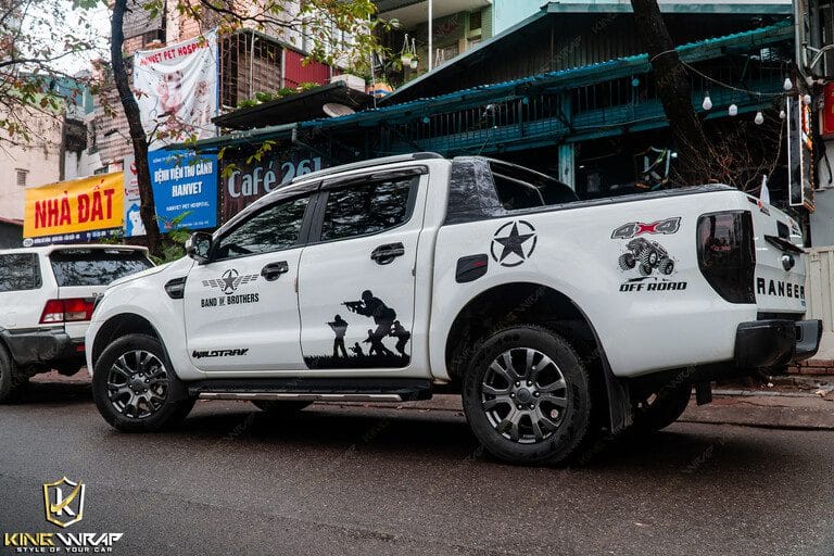 Ford Ranger dán tem xe oto phong cách quân đội, team chiến hữu tại Kingwrap. Trên nền trắng của chiếc Ford Ranger đã phối lên bộ tem phong cách chiến sĩ, theo đó là tinh thần đồng đội, với tông màu đen. Đã làm nổi bật lên bộ tem, đầy phong cách, cá tính, một chất riêng của người lính. Đến với Kingwrap xế cưng của anh em sẽ nhận được những mẫu dán decal đổi màu ô tô, dán tem xe ô tô đẹp nhất hiện nay.
